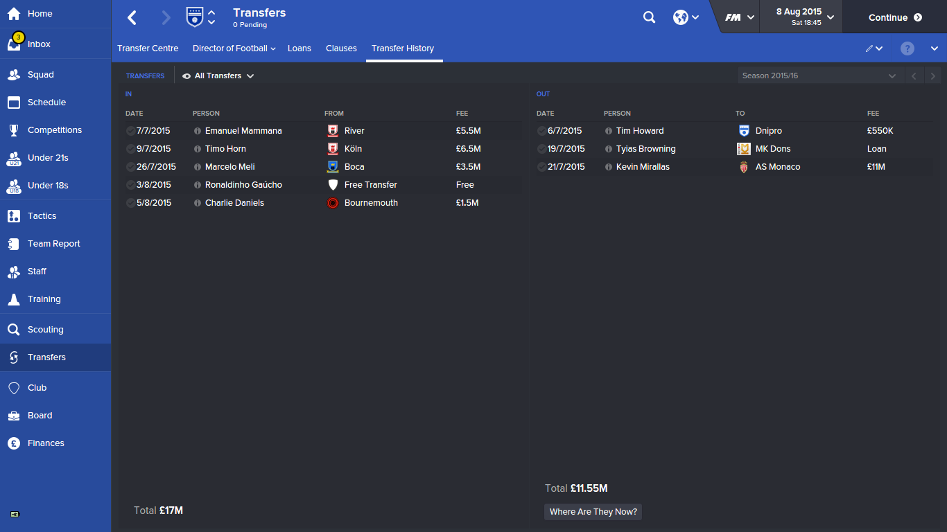 I will be on the market for a Keeper, Center Half, Left Back and Center Mid. There should be some developments on this front for the next update as well as formation ideas and preseason results.