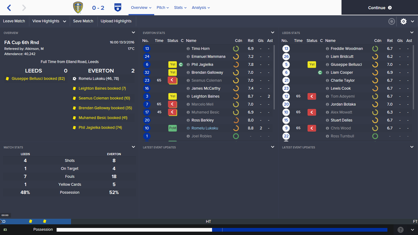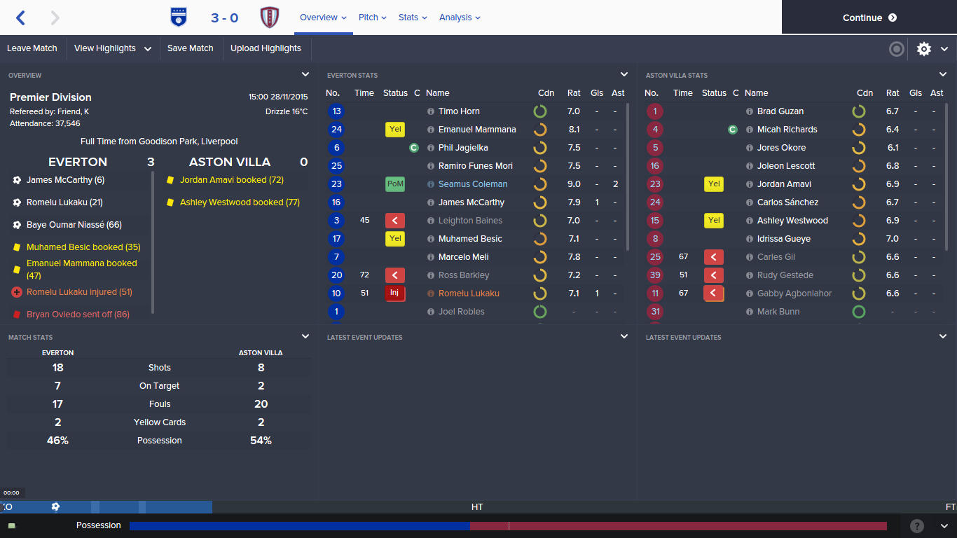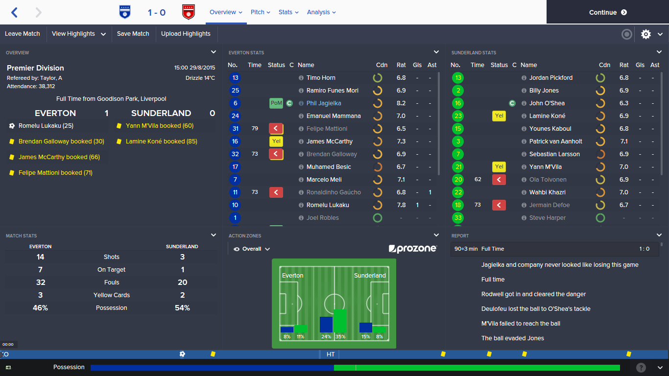 They take the lead with a goal from Iturbe, Great response from the lads straight after half time with Baines crossing for Lukaku. Lukaku is a horse of a man. Jags gets the winner in the 88th minute from a corner, Captain Fantastic!