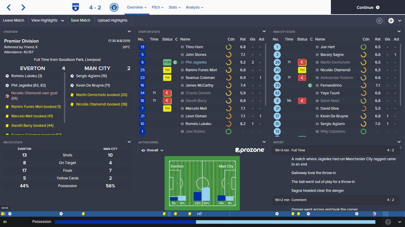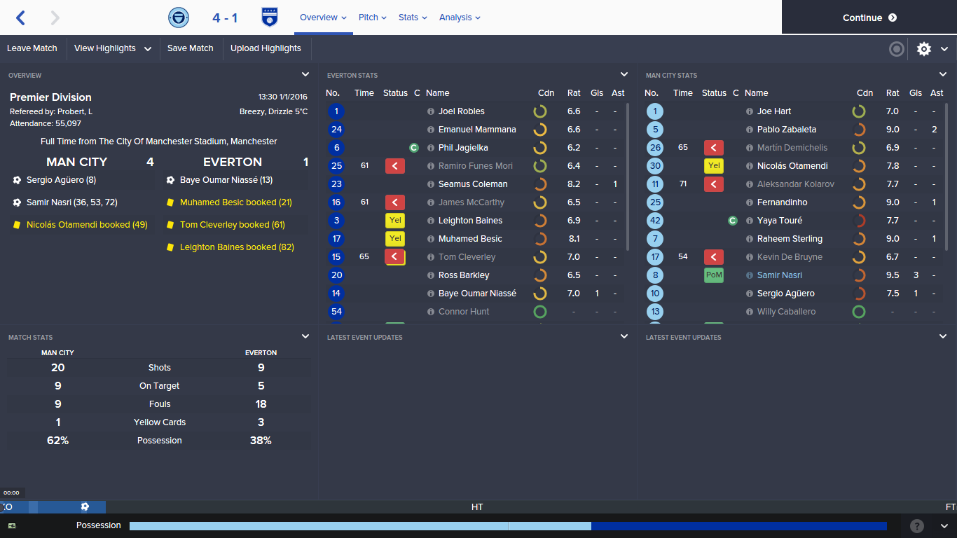 Late goals from Jags and a Otamendi own goal sealed the win for Everton after they twice took the lead but were clawed back by City with goals from Aguero n De Bruyne. Great win for the Toffees, Coleman impresses along with Jags. Poor debut from Daniels, Young Galloway grabs a late assist after coming on as a late sub.