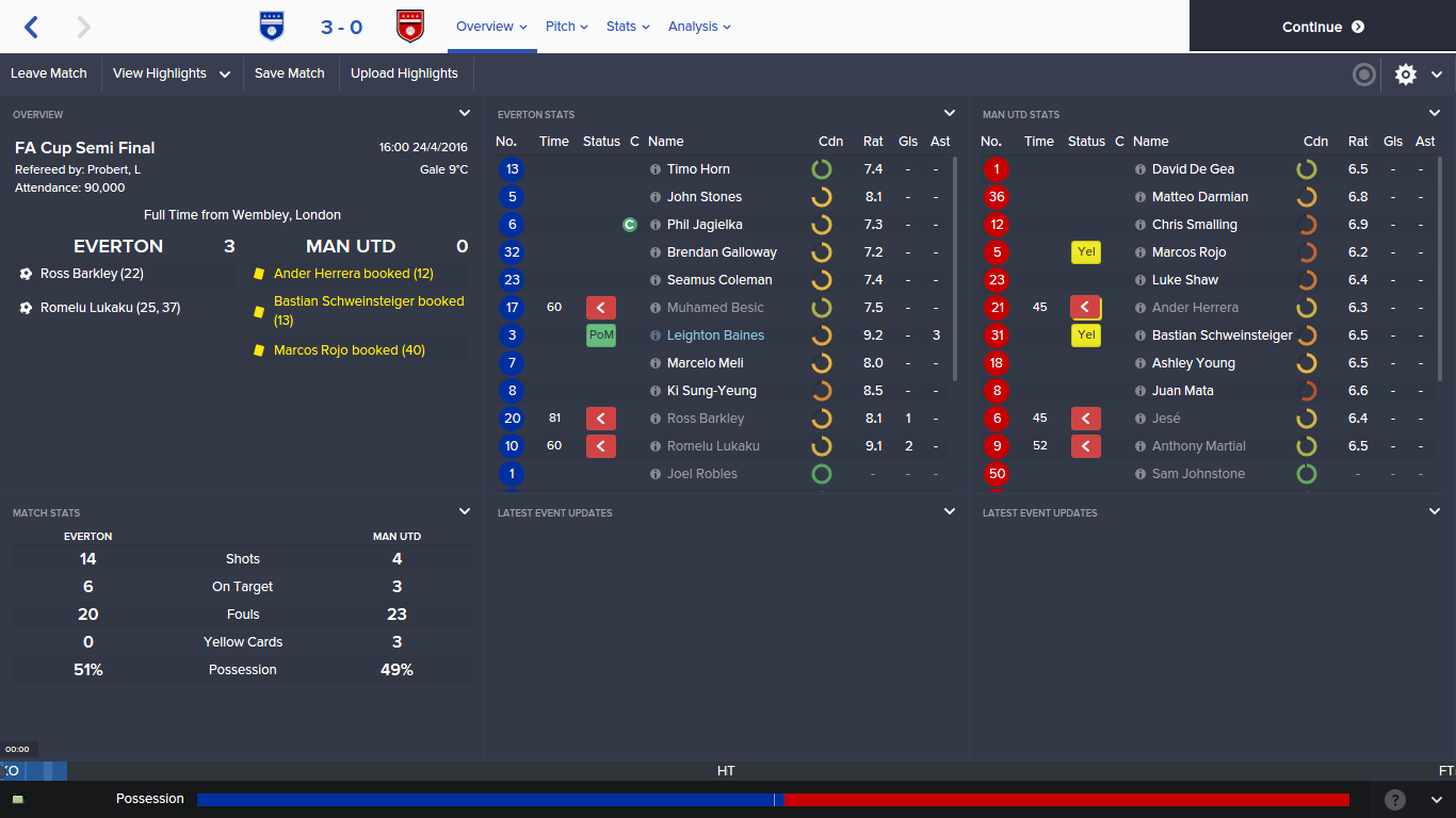 We are through to the FA Cup Final!!! We blew away a poor utd side who recently sacked LVG and replaced him with Jose. Barkley opens the scoring before Lukaku added two more before half time! Leighton Baines with 3 assists and Swansea await us in the final.