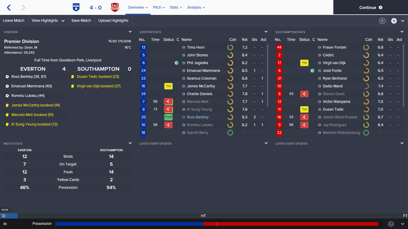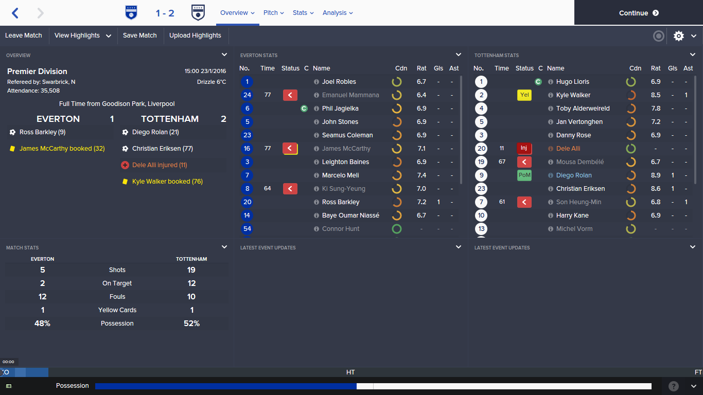 Terrible result, Spurs battered us. Kane started off the scoring with a header at the front post, Chadli adds a second. Stones at fault for both but Coleman went awol as well. Coleman redeems himself with a great ball in for Lukaku’s goal. Son scores the third for Spurs with the defence all over the shop at a set piece and a 4th from the peno spot. Stones hauled off a H/T, Ronny makes his debut and assists Mammana for our 2nd. Bad day at the office, Dembele was huge for them, he bossed Barry in the middle of the park.