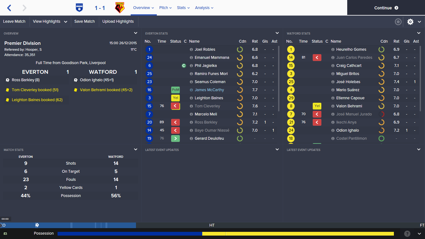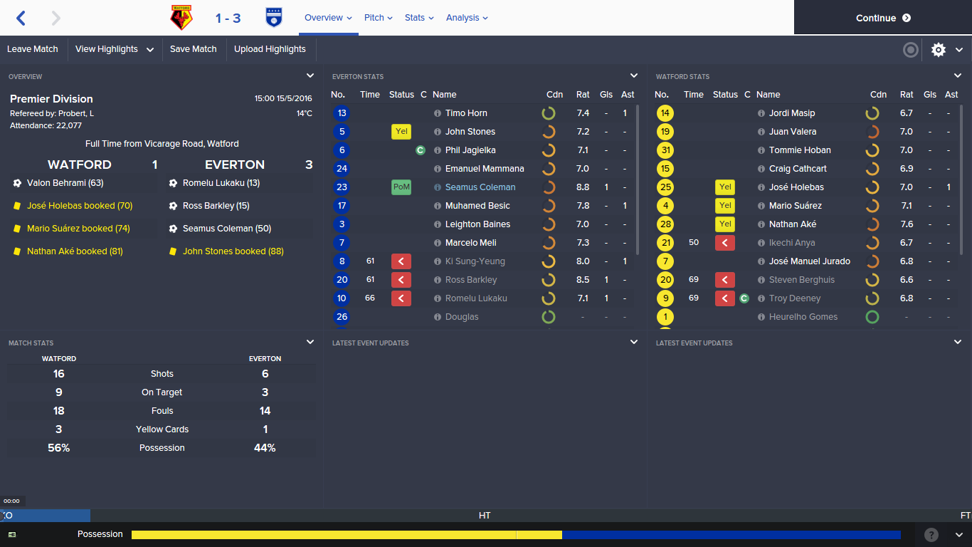 Lukaku opens the scoring from a Timo Horn kick out!! Barkley makes it two on the counter attack from a Watford corner. Coleman scores from a knock down from Ki in the 2nd half, Behrami scores a late header as a consolation for them. We finish in 5th position in the league and that’s enough for us to qualify for the Europa League.
