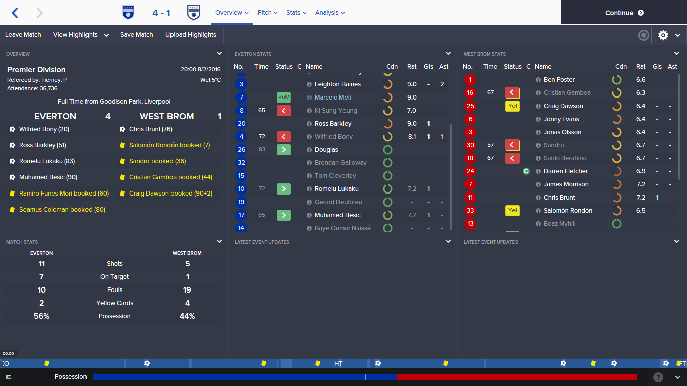 Bony opens the scoring from a Baines cross, Barkley gets the 2nd after a lovely 1 2 with Bony. Brunt pulls one back for West Brom in the 75th minute. Lukaku scores the 3rd after his long lay off and Besic adds the 4th. Good win for the boys.