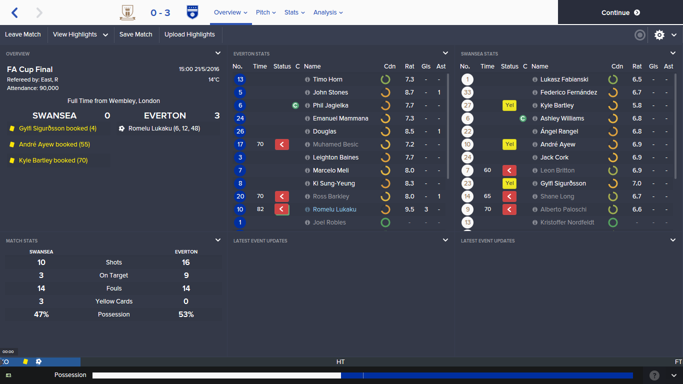 Well that’s the season ladies and gentlemen. We ended up finishing 5th in the Premership and winning the FA Cup. I think that can be considered a successful season. We faded a bit over the winter months with the loss of Timo Horn and Lukaku but were more than a match for the top teams with everyone fit. We will break the top 4 next season.