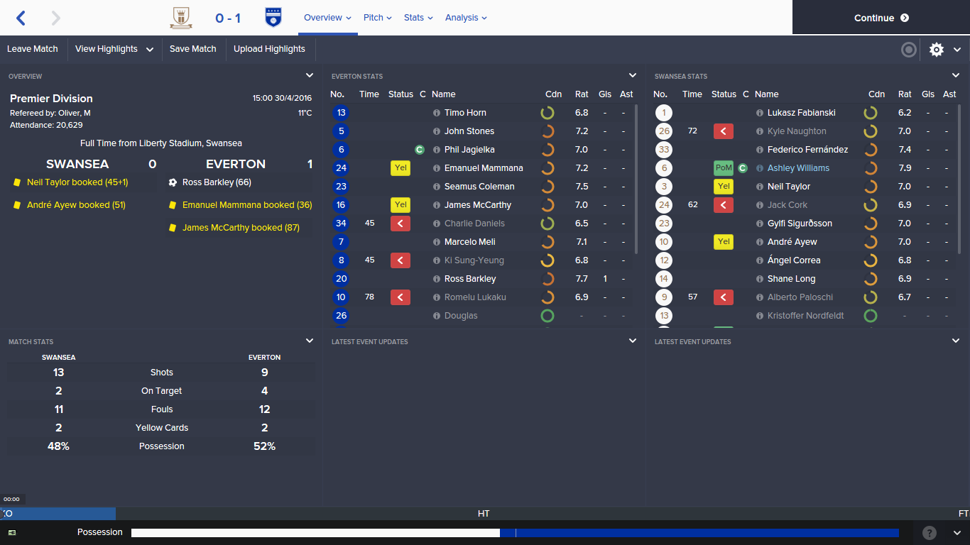 This was a tight game but the breakthrough finally came in the 66th minute. Besic who came on at half time swings in a corner, Fabianski drops it and Barkley pokes home. Big win as it moves us up to 6th place.