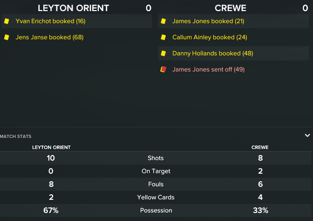 After knocking Portsmouth from the top of the league table we aimed to do the same to Crewe, but despite them going down to 10 men early in the second half, we were unable to manufacture a goal. A whopping 67% possession gave us ample time to carve apart the Crewe defense, but blocked shot after blocked shot kept us from adequately testing our keeper. With only ten shots attempted and none of them hitting the target, it's impossible to say we deserved a win, but having them under siege for the better part of 40 minutes felt like an eventual breakthrough was inevitable. The lack of shots is concerning, but I may need to look at individual instructions as I either instruct the team to work the ball into the box (which has limited our overall shots), or it seems the team starts firing wildly from anywhere within 30 yards of the goal.