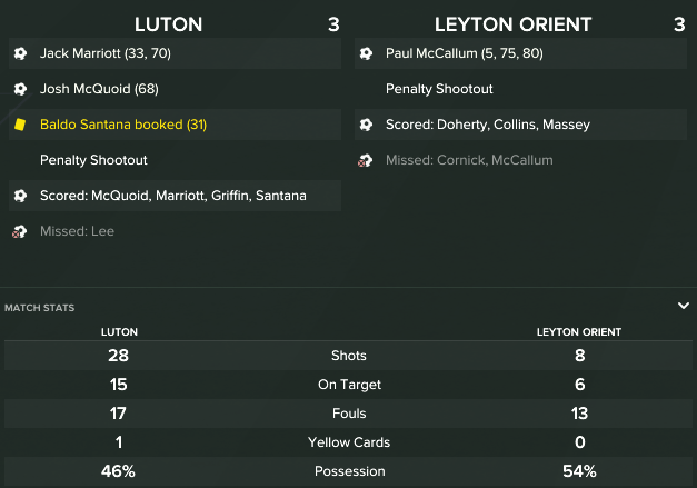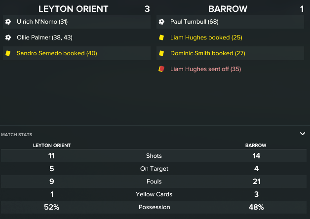 That's more like it! Three goals before the half and we were able to coast through the second half, conceding one in the 68th minute (and I have to admit, I got a little scared). Barrow was down to 10 men after 35 minutes after two yellow cards (they accumulated 21 fouls over the course of the entire contest) and seemed to play very negatively now that they were the visiting squad. Ollie Palmer was the standout, scoring a brace in a span of 5 minutes including a beautiful strike from just outside the area. We reverted to our 4-4-2 to get some extra presence from our strikers and try and keep things simple against the (lower) lower league club. On to the next round against fellow League Two club Accrington!