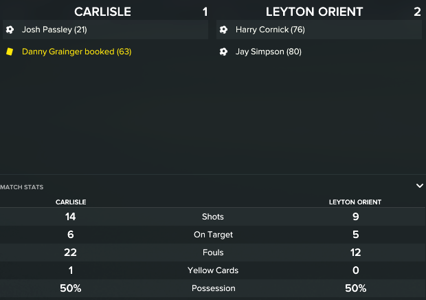 Palmer and McCallum were given another run out after their strong offensive performance in the cup game, but were unable to get anything going against Carlisle. Down 1-0 at the halfway mark I decided to bring Jay Simpson back into the fold off the bench and he made his presence known as he tallied a goal and an assist to bring us back to secure our second consecutive victory of the season. He linked up with man-of-the-match Harry Cornick who also recorded a goal and an assist. The offense seems to be sorting itself out and being able to form a comeback in the final third of the game is a very encouraging sign moving forward. With both wins coming on the road, it is looking like the club may be ready to turn a corner and start a push towards their pre-season expectations.