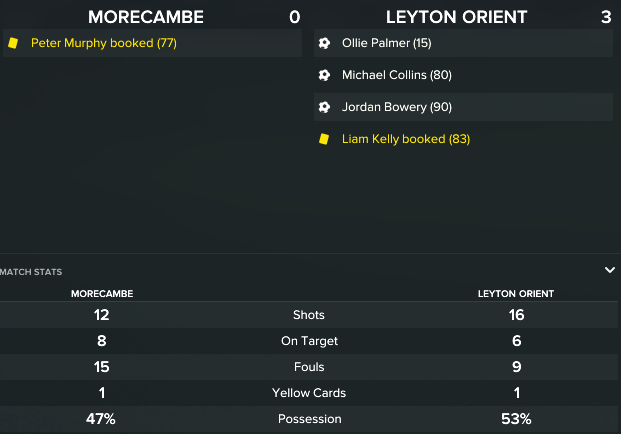A vital turnaround by the club as they were able to put three past Morecambe while keeping a clean sheet at the back. Ollie Palmer made good use of the faith I put in him after his strong cup performance and put us ahead 1-0 early on with a tidy finish in the 15th minute. Substitutes Michael Collins and Jordan Bowery would add to the tally to secure a much needed victory.
