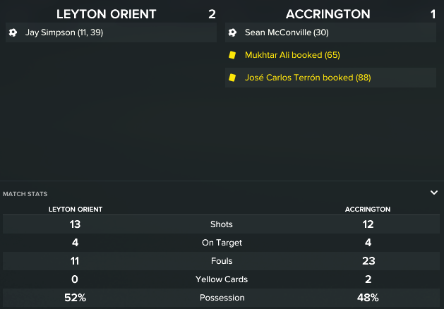 An interesting note for this match was that as Accrington commits a fair number of players forward in their attack I opted for a 4-1-4-1. This left a concerning distance between my midfield and lone striker, but some special instructions to my two talented midfielders, Benedicic in the middle, and Cornick on the wing to get forward and link up with Simpson, we were able to be effective across the pitch.