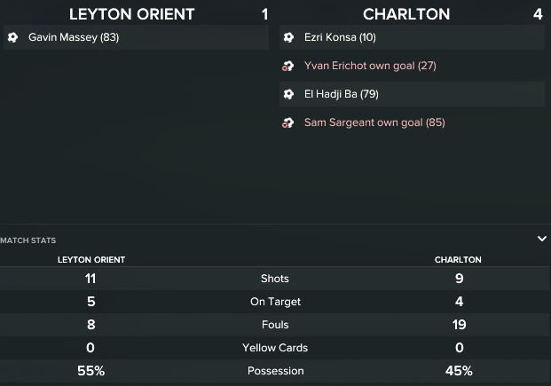 I ran out a secondary lineup for this match with 8 of my starting 11 not being regulars. From the midfield out we looked pretty good. We controlled possession, manufactured some good chances, but the slight drop in overall talent seemed we were destined not to put too much on the scoreboard. At the defensive end we were woeful as we conceded two own goals and simply allowed Charlton to make far too much of the limited opportunities that they had. On the plus side, I didn't care much about this competition and can turn back to focusing on the league.