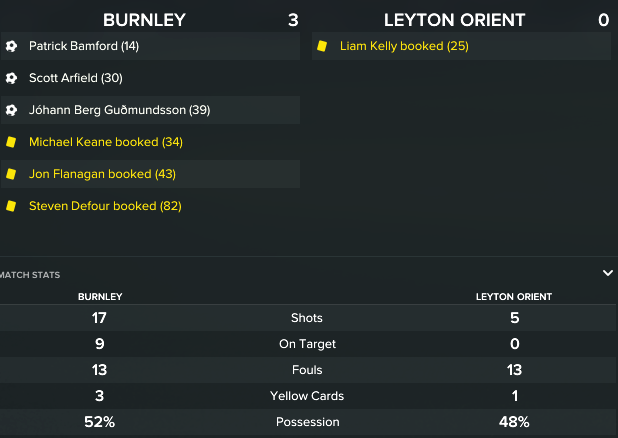 An expected result and one that I can't exactly be upset about. Although Burnley certainly aren't giants of the Premiership, we were clearly outmatched and outclassed here. Burnley scored three in the first 40 minutes and then we were able to actually put in a good shift in the second half and generate some half-chances, but ultimately failed to find the back of the net (again). This was also, for the most part, a reserve lineup as I gave some much needed time off to anyone who I had a serviceable backup for.