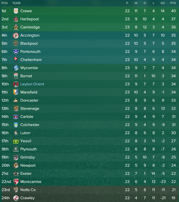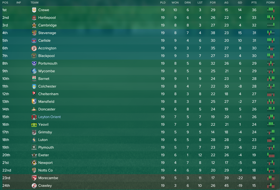 Two wins and two losses in the month of November left us in 15th place in League Two. Prior to the 5-1 thrashing in Doncaster, we were boasting one of the best defensive records in the entire league with only 15 conceded in 18 games. Our offence has been a bit of a struggle with only 19 goals through 19 contests, but we're still only 4 points from a playoff spot and 6 from automatic promotion. With the halfway mark of the season still in front of us I'm cautiously optimistic and hope to find some way of improving the squad (and my tactics) in the coming weeks.