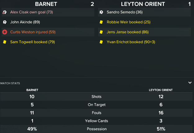 The team played well and we certainly deserved to win. Entering half-time we had a comfortable 1-0 lead, controlling more of the ball and having the better looks at goal, the game felt well in hand. This continued throughout the 2nd half until a stray backpass to Alex Cisak led to one of the most bizarre own goals I've ever seen. The pass came back to Cisak and with the Barnet striker closing him down he fired it off the post and in to his own net. Partially due to my own frustration, I opted for a more attack oriented mentality, which as the visiting club was like a mistake as we would concede the winner in the 89th minute and drop a very frustrating game.