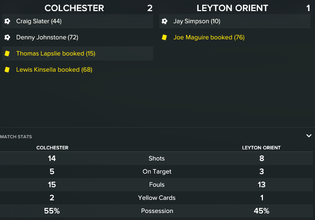 Jay Simpson put us up one early on and Colchester controlled the match from there. I don't like over-reacting with my tactics, so I tried to fight to regain control of the match instead of turtling and playing to not lose rather than to win. Another conceded goal just before the halftime whistle threw everything up in the air and the team never really recovered. An injury to one (Zan Benedicic) and international duty for the other (Robbie Weir) left my central midfielder position fairly devastated. But Zan would hopefully be back soon, and Robbie made his first two appearances for his country, so I certainly can't be upset there.