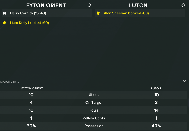 A textbook "bend, but don't break" performance from the club as we gave up plenty of chances, but they were mostly from a distance and we were able to hit them back on the counter. Jay Simpson has been in good form and opened the scoring in the 60th minute, while Harry Cornick sealed the victory in the 77th minute with a great volley from just inside the penalty area. Cornick has quietly become my best player this season, putting in consistent performances from the right wing. He has been crucial both for his finishing and his playmaking abilities and I have begun to run a lot of my attack through the right flank.