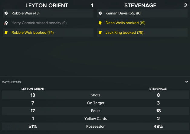 Well, we scored - finally. A missed penalty in the 9th minute made it feel like this club was doomed to never hit the back of the net, but club captain Robbie Weir put us up 1-0 in the 43rd minute capping off a wonderful move that linked nearly 20 passes together in its buildup. However, Stevenage striker Keinan Davis was to ruin the evening with a brace that saw The O's drop their third consecutive league game and find themselves alone at the bottom of the table, the sole club that has failed to earn a point through 3 matches.