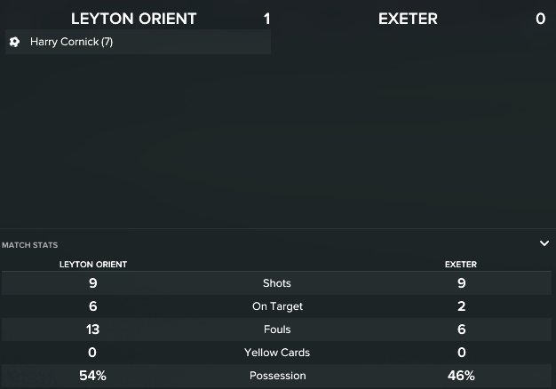 As different as a match as you could believe from the Blackpool fixture, while registering the same scoreline. Fairly defensive, evenly contested with limited fouls and no cards. Harry Cornick once again hit the back of the net, this time in the 7th minute (he seems to be getting better every game). However, another victory brought us up to 12th in the table, and with the top half very congested, another win could bring us into a playoff position, or at least very near to one.