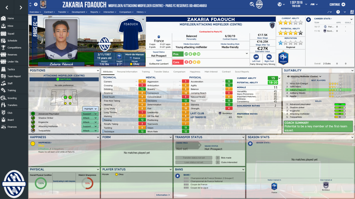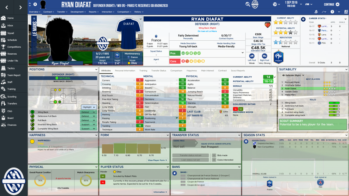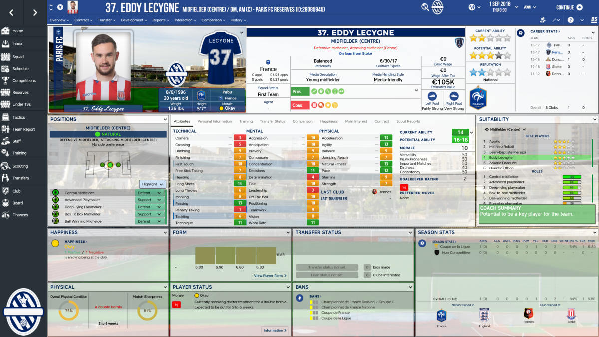 Lecgyne was my first signing since joining PFC. He has a lot of talent and potential. His strengths are his potential, personality, pace, shooting from distance and versatility. Weaknesses include determination and the lack of fitting in with the rest of the club. Since joining he has only made one appearance in the Coupe de la Ligue first round victory over Troyes. Since then he has been out with a double hernia.