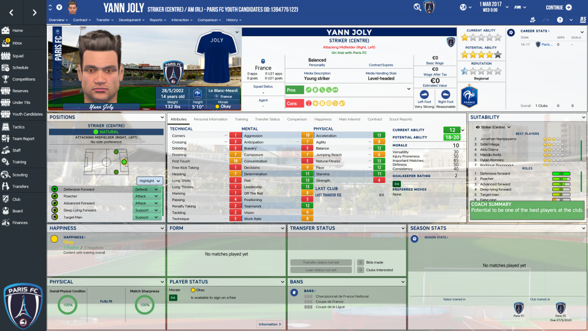 Despite the fact Yann is listed as a striker he can easily play on the wings with no issue. I have a lot of good things to say about this player who has a chance to become a superstar for us. Yann could be making his first team debut before he turns 18.