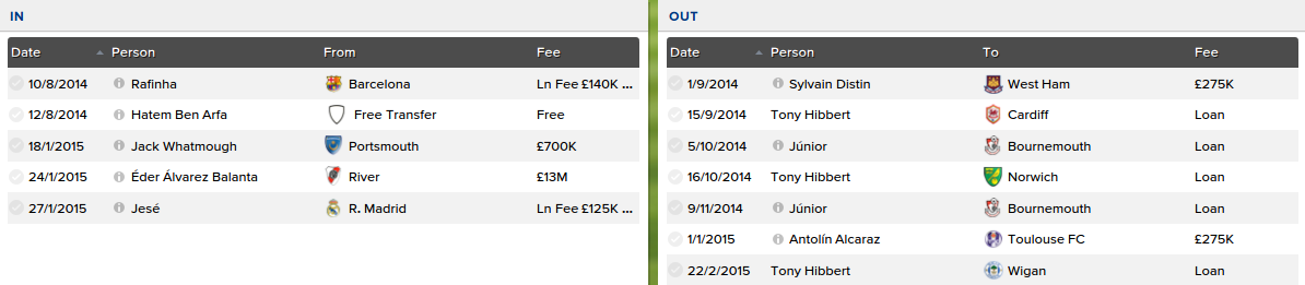 In the departure section, I offloaded 2 ageing centre backs in Sylvain Distin and Antolin Alcaraz to make way for players such as Balanta and John Stones, as well as loaning out some bitpart players in Junior and Tony Hibbert.