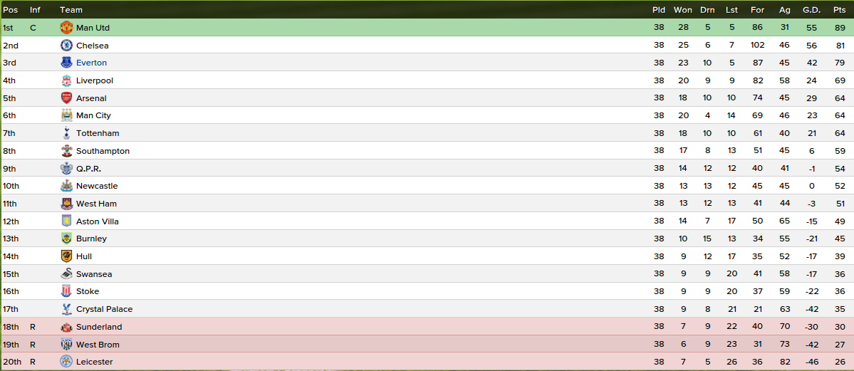 We exceeded all expectations, finishing in a Champions League spot and at one stage threatening the title. We had a massive run of form through mid-season off the back of some heroics from Romelu Lukaku but struggled a little at the end. Nonetheless, absolutely chuffed with the way we conducted ourself in the league and I look forward to Champions League football next season. Some better results included a 4-0 home win over Manchester City, a 4-3 win over Arsenal, a 5-2 home win over Chelsea and a plucky 1-0 win at Old Trafford.