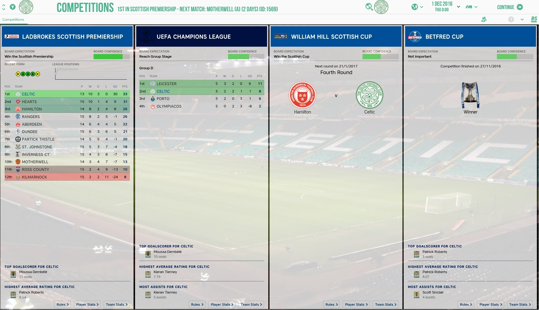 Through 13 matches Celtic are in control with 33 points. In Champions League Celtic are currently in second behind Leicester City with 8 points.