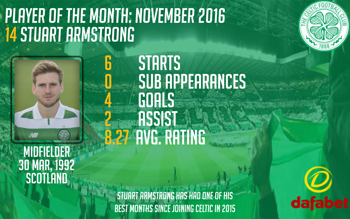 Stuart Armstrong had one of his best months in the green and white hoops as he is the November Dafabet Player of the Month. He did everything from scoring to assisting and defending. His stellar play included a two goal game at Killie. In this match he scored two goals back-to-back in the first five minutes of the game.