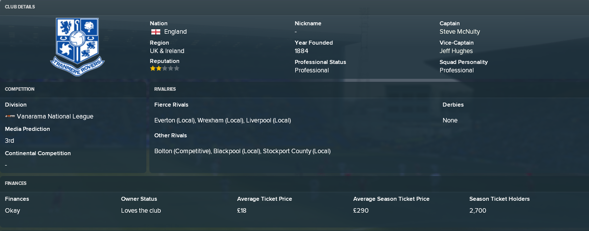 So here it is, my journey into the world of football (manager). My aim in this career is to win as many trophies as I possibly can. I will be beginning my journey with my favourite team, Tranmere Rovers of the Vanarama National League.
