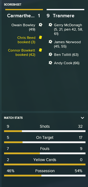 Tranmere: Davies, Vyner, Karic, McEveley, Ridehalgh, Scott, Dawson (Gribbin 62), Norburn, Tollitt, McDonagh, Norwood.