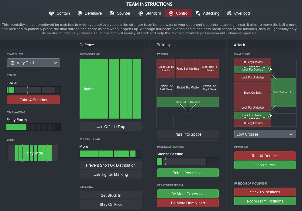 The second point refers to high levels of collective and individual teamwork. This point is the foundation of our tactic. We must rely on every single individual's ability to work collaboratively when attacking and defending. The third point supports this statement; we need to press high up the pitch and win the ball when out of possession whilst we also start attacking moves from deep. Point 4 refers to possession football. It's pretty self-explanatory. Lastly, we are going to play wide once we have possession while also looking for overlaps to bring a variety to attacking moves.