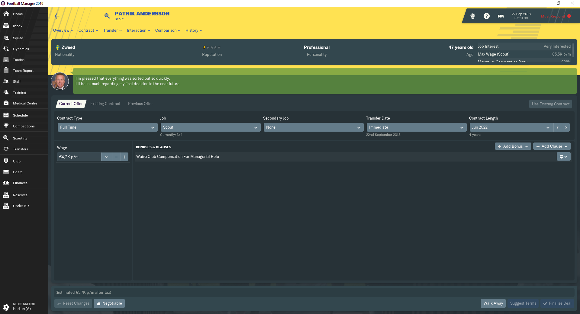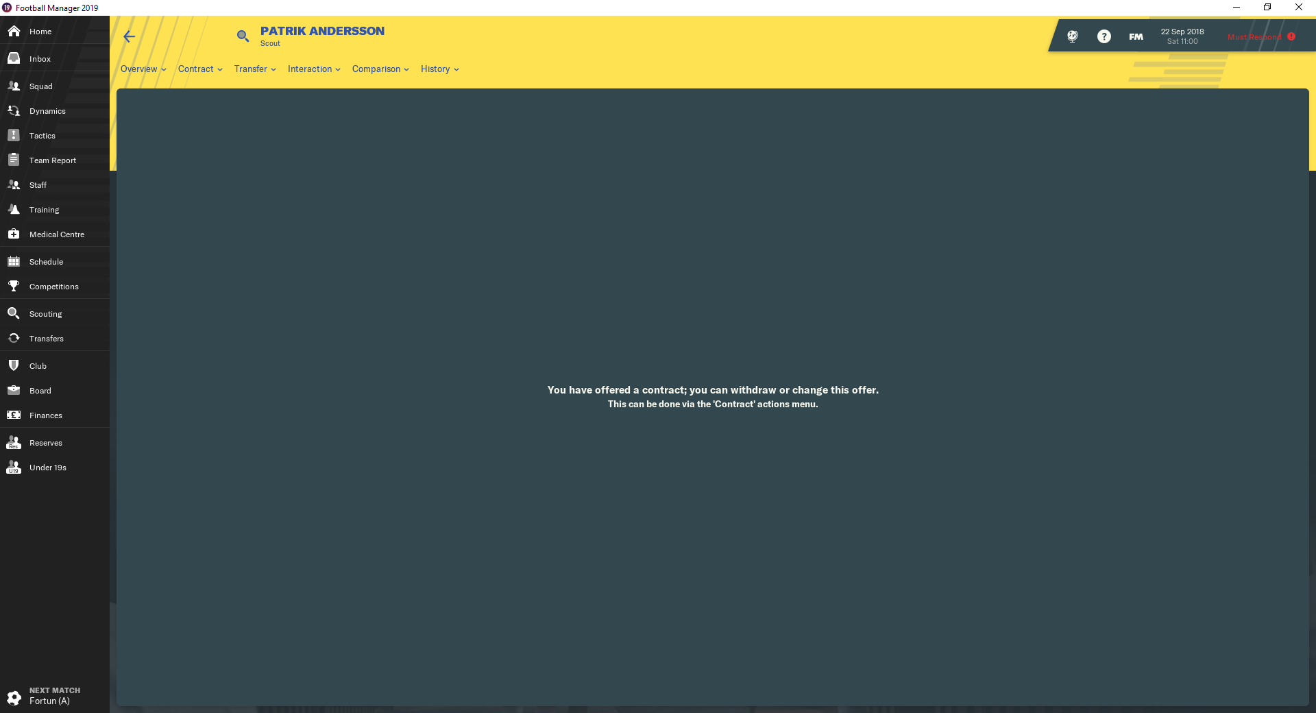 Right before a match I offered a scout a contract and he accepted my offer, but it isn't official yet.