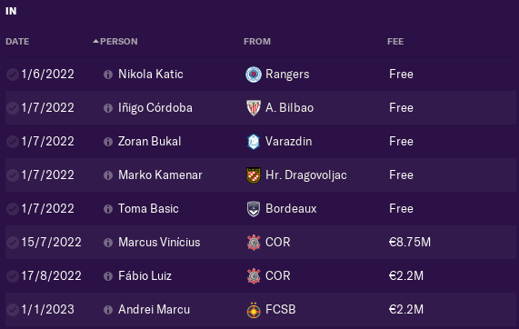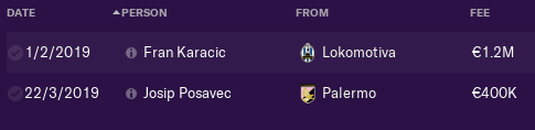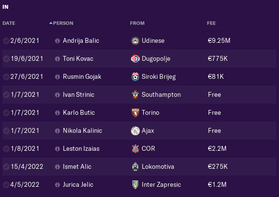 Next transfer was youngster from NK Siroki Brijeg - Gojak. Than 2 former players come back for free LB Ivan Strinic and ST Nikola Kalinic, maybe they have 34+ years but they will help, next was Karlo Butic bought for free beacuse he can play as ST and as Winger and last transfer was CB from Brazil 18yo Leston Izaias.