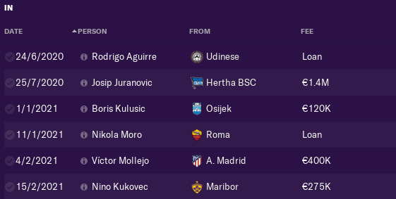In the winter transfer window was very busy. Ante Palaversa want to leave the club and i sell him in RBL for 7,5 mil €. Nikola Moro is brought on loan, we buy 3 youngsters Kulušic CB from Osijek 18yo, Nino Kukovec ST from Maribor and Mollejo winger from Atl. Madrid.