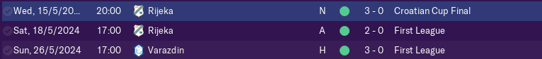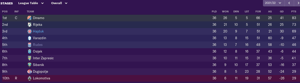 In league we had were 2nd behinde Dinamo Zg. On the winter break i bought couple of players like WInger Menalo from Dinamo, than Bistrović DM and Vuk also Winger from Rijeka. In the second part of the season we played very well but Dinamo played also good so the diference in 3rd month was the same as before winter breake so we fought but it wasn't good enough we finished 2nd behinde Dinamo Zagreb.
