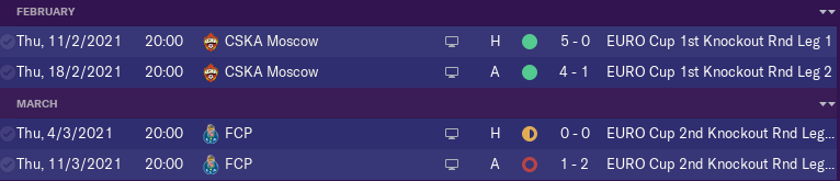 Porto 2nd knockout round, first macth home and we play 0-0 we were much better but we did not score. Now away things started very well for us we scored for 1-0 but they made comeback and score 2 goals we tried to score 1 more but we couldn't and we are out.