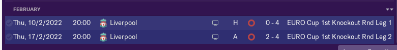 In the semis old 'friends' Liverpool, they have team to win Champions League and it become tradition that we need to face each other in every Europe campaigne and they won last years Europa League. This time was no difference, i only can not finde way to beat them the beat me with 4-2 and 4-0. There is no place for disapointment we have couple of rounds left in the league and we are close to win new title.