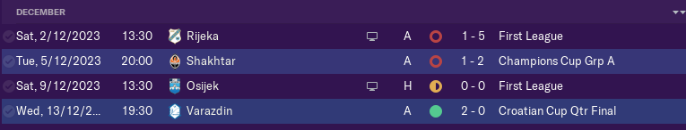 Next couple of games was not good for us we lost next 2 and draw 1 only vicotry comes in Cup 1/4 finals befor winter breake. We lost at Shakhtar at the last game in group stage of Champions League.