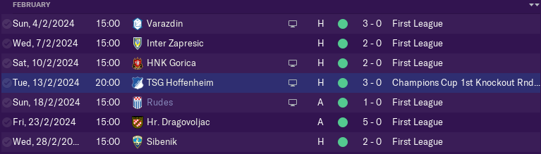 We beat Varazdin, Gorica and Inter Zapresic in Croatian League without conceding a goal. And than 1st game of knockout stage at home against Hofenheim. It was a very hard game with a chances from both sides but we take a win 3-0.