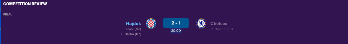 In 65th minute Grgic miss the 100% chance or better save Kepa save the 100% goal and it is corner for Hajduk and then Balic cross from the right, Svec comes to the near post and score a header for 1-1, unebeleviable i can not belive, we are celebrating in the room as we are playing for real. I want to make it to standard but friends tell me stay like that stay attacking and we are better we make chances, Chelsea can not make single pass, Balic is playing like Iniesta in his prime he is unstopable. And it's 86th minute it's out on the right side for Hajduk Luiz take ball back to game Svec pass to Kukovec and he give ball to Dzeko in the space, Dzeko shot from the 14 meters from the right side and Dzeko scores, Dzeko scores, Dzeko scores it's 2-1, 2-1 for Hajduk it's only left couple of minutes.