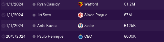 We bought ST Ryan Cassidy, Czech wonderkind AM Jiri Svec 18yo, perpective 17yo Croatian striker from Zadar Ante Kovac, and 18yo Brasilian CM Pauo Henrique.