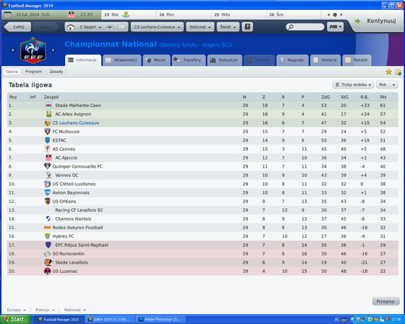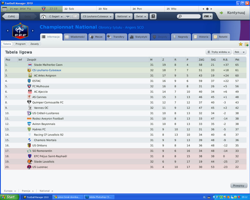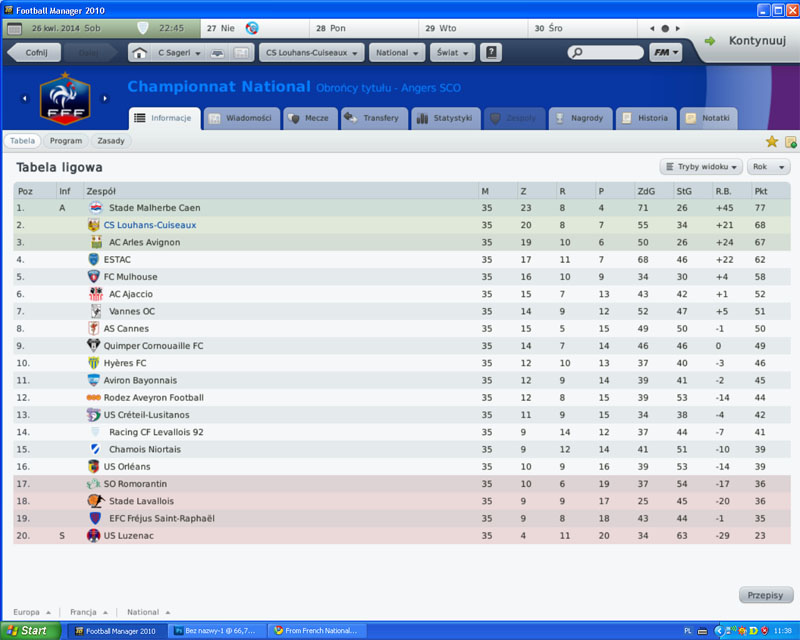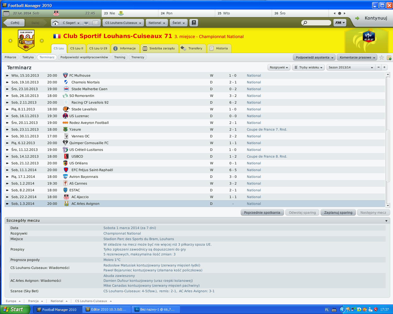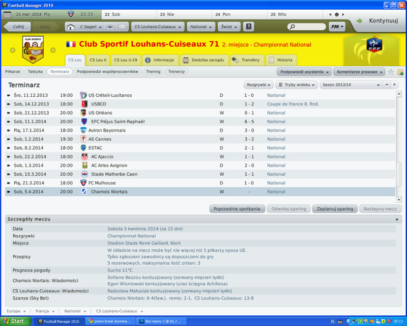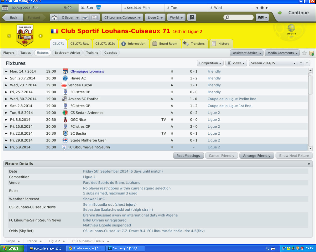 Match against Frejus was with lots of chances thats why score was so big and i very proud that i won but i think that was lucky because they had red card and i only won by 1 goal so. I was very pleased with Marcin Sobczak performance because he scored 4 goals against them so that good and thanks to that he had 10 goals in 18 games and he is my top goalscorer in the leage and ever.