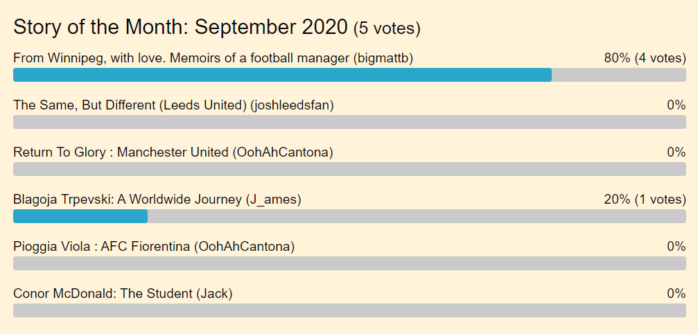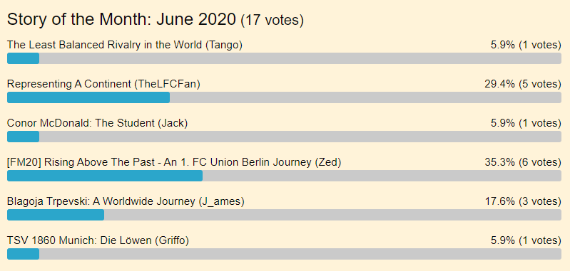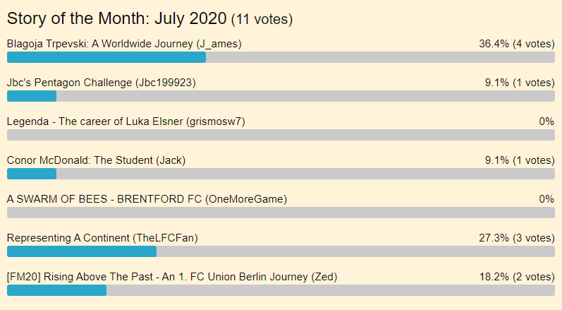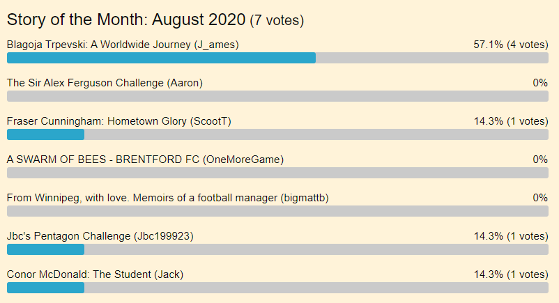 2020-08-08 12:58#276931 J_ames : Big thank you to everyone who voted for my storyThere's a lot of quality on the forum atm, so it's a big compliment to have been considered.