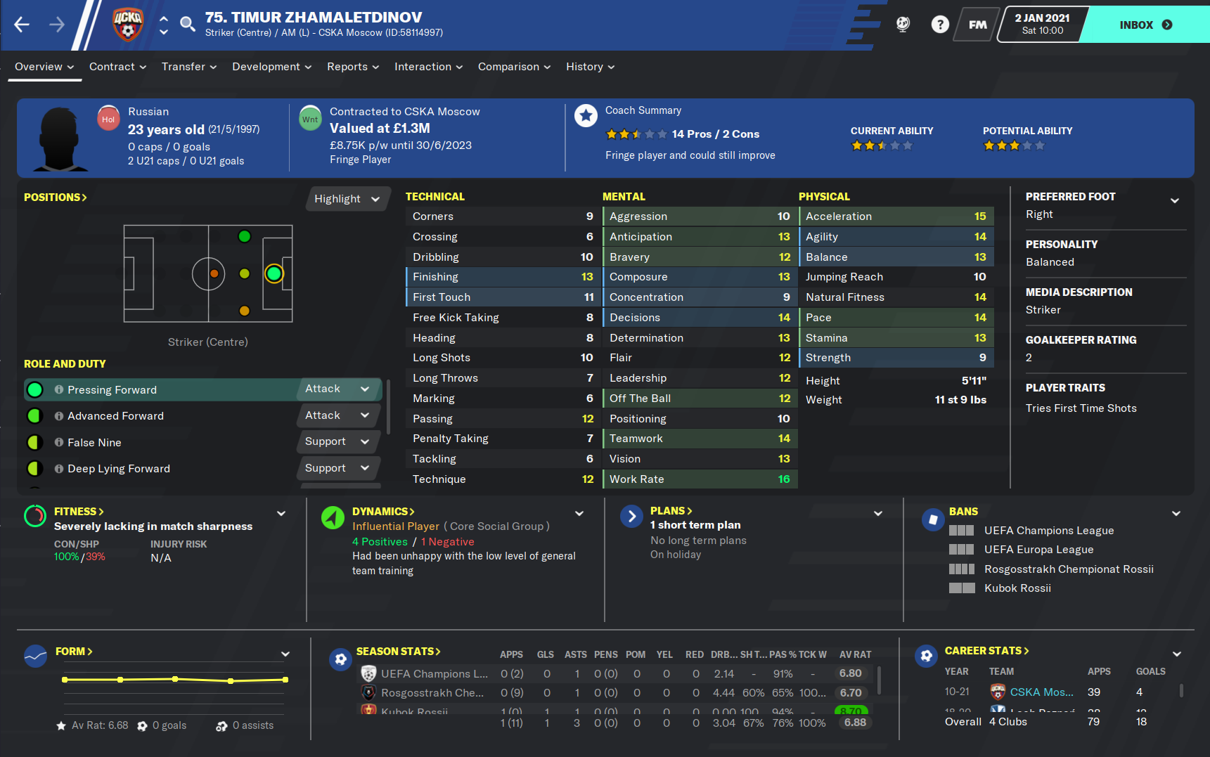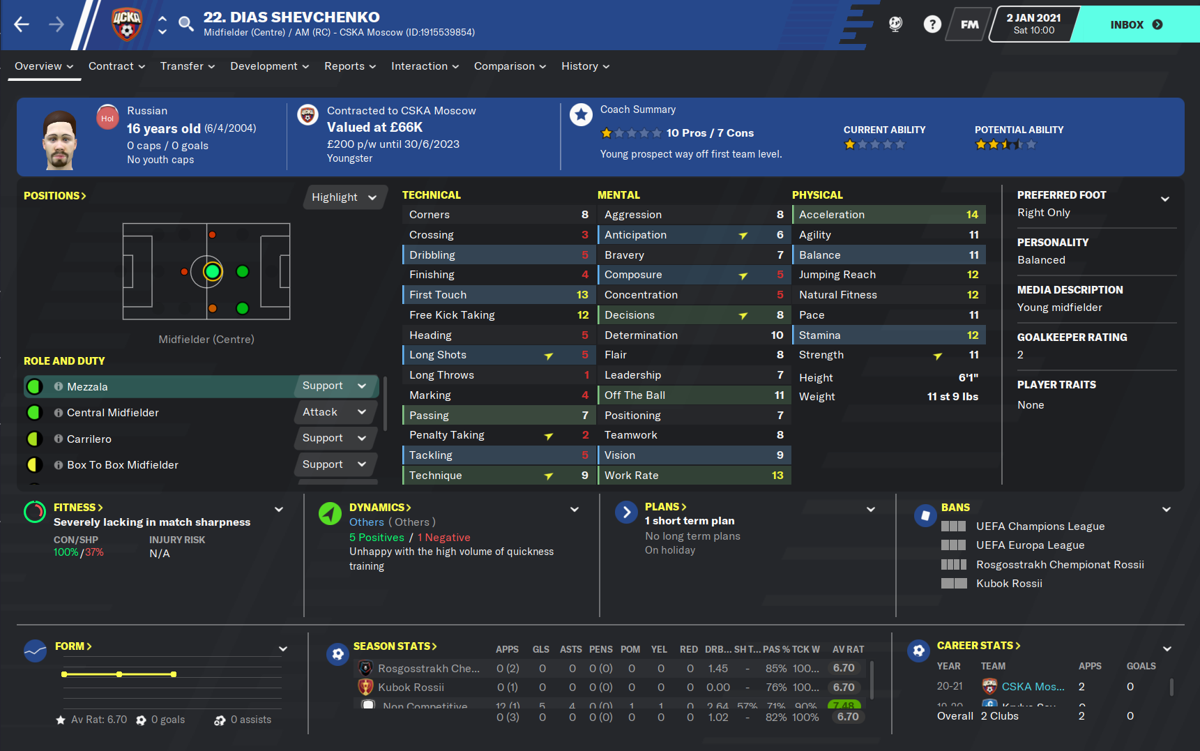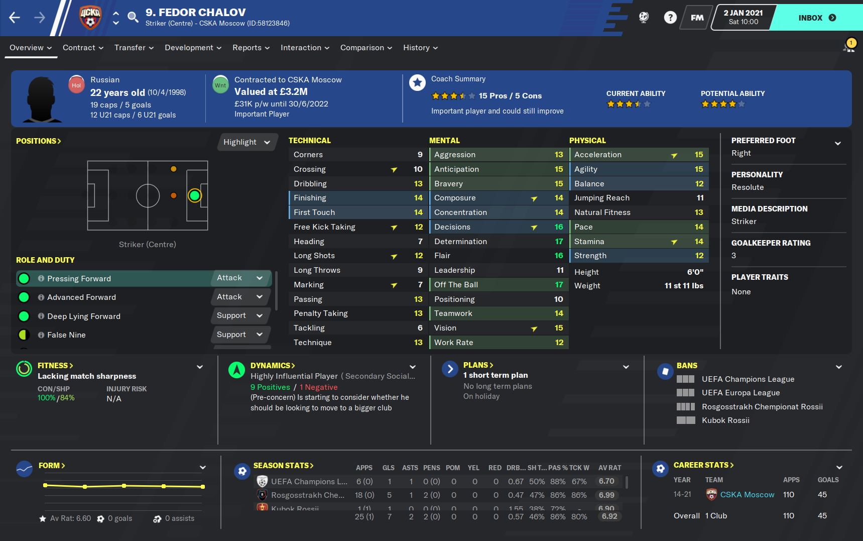 The two other potential players both have major issues that could prevent them from being able to star in the rest of this season. Danila Yanov was the backup to Vlasic last season and impressed, scoring twice and assisting twice in his seventeen games, although fourteen of those matches came from the bench. However, Yanov was this year allowed to go on loan to try and further his gametime and hopefully his development. But the loan isn’t seemingly going to plan with the playmaker scoring just three goals in twenty-seven games for second division strugglers Fakel. The loan is expected to be terminated this window but whether Yanov will be able to replace the influence of Vlasic after what must have been a confidence knocking six months, is yet to be seen.