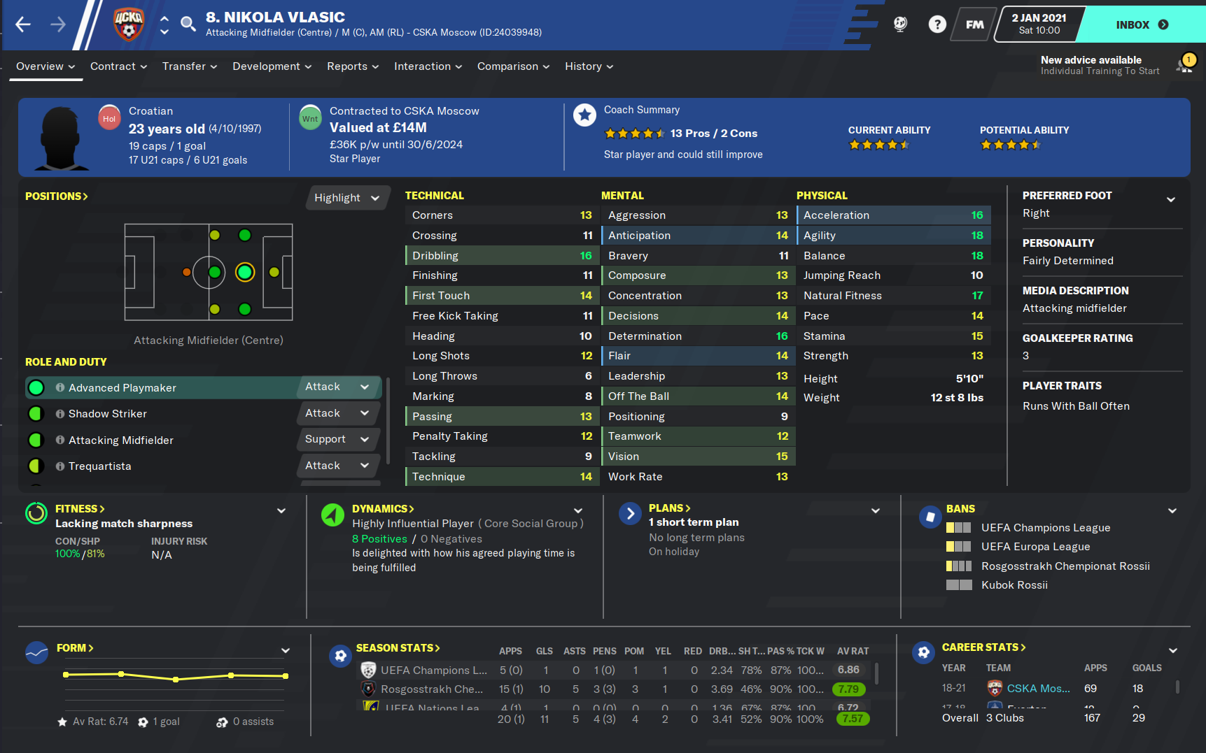 Despite impressing in periods, Nikola struggled in his first full season as a CSKA Moscow player, scoring just three goals and having five assists in his twenty-eight league games. However, with another season behind him, the Croatia star impressed from the off this season, scoring a first half hattrick in the opening game of the season against Tambov. Since then Vlasic has continued to be influential scoring a total of ten goals and five assists sixteen games this season.