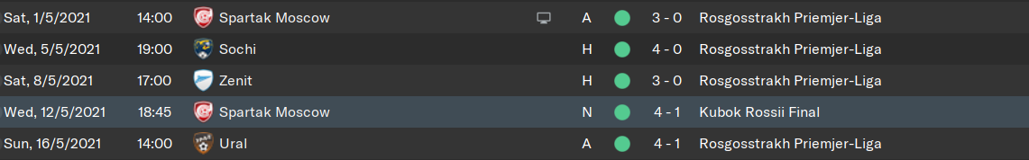 Following those losses, CSKA won fourteen of their next fifteen competitive games, drawing the other one. It began with a 2-0 victory over Krasnodar with CSKA advancing into the Kubok Rossii semi-final.