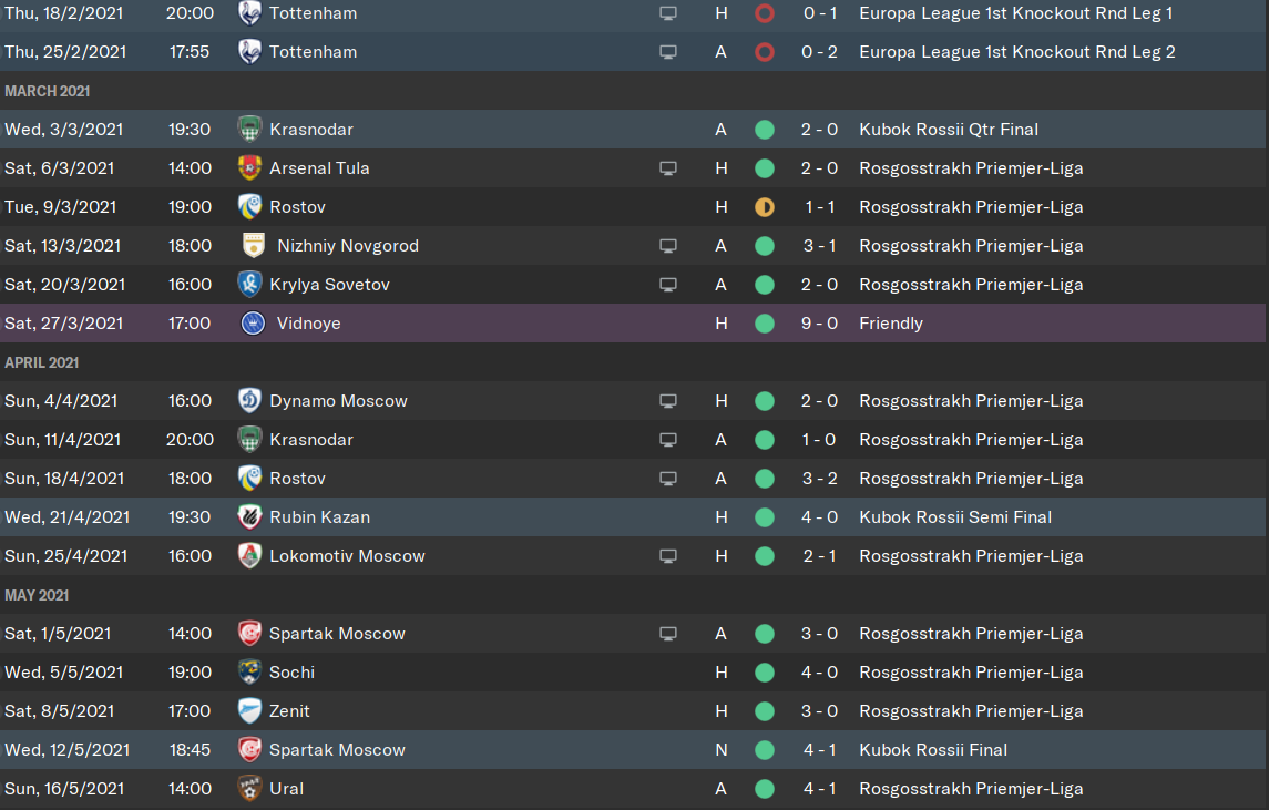 Back to back wins over Spartak Moscow and Zenit St. Petersburg saw us retake the lead at the top of the league, a position we wouldn’t give up for the final eighteen league games. The first half of the season also saw us feature in the Kubok Rossii. We started our campaign in the cup against local side Chertanovo Moscow, who we comfortably dispatched in a 5-0 win. We then beat Nizhniy Novgorod in the next round, 2-0, to set up a quarter-final match against Krasnodar.