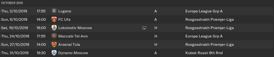 Maksim Smirnov - To end this month's review, let's have a look ahead to next month. We start of the month with our second Europa League tie against Lugano, a team everyone is expecting us to beat. We then play FC Ufa before a derby game against Lokomotiv Moscow. Following the derby, we have another Europa League game, this time facing Maccabi Tel Aviv. To end the month, it’s a home game against Arsenal Tula and a cup game against Dynamo Moscow, which once again pushed Luke's first managerial match against Zenit back, having done the same with our cup game this month.