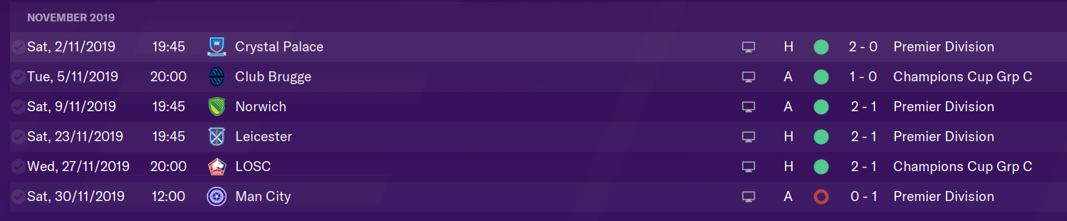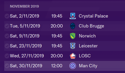 Our favourable run of fixtures continues in November, building up to Manchester City away at the end of the month. We also have two fixtures in a tight Champions League group to negotiate. Here are those fixtures: