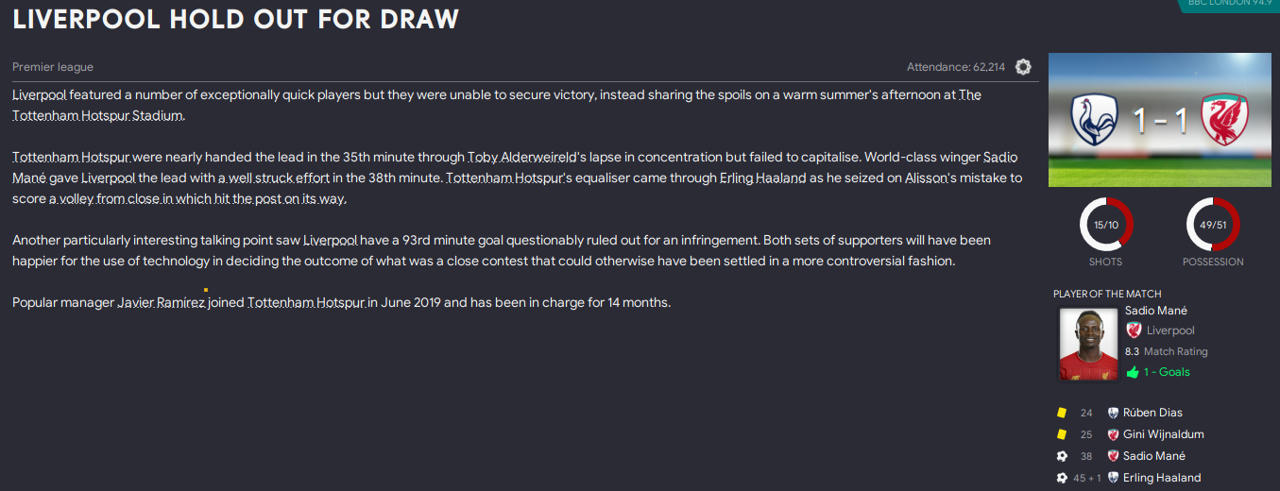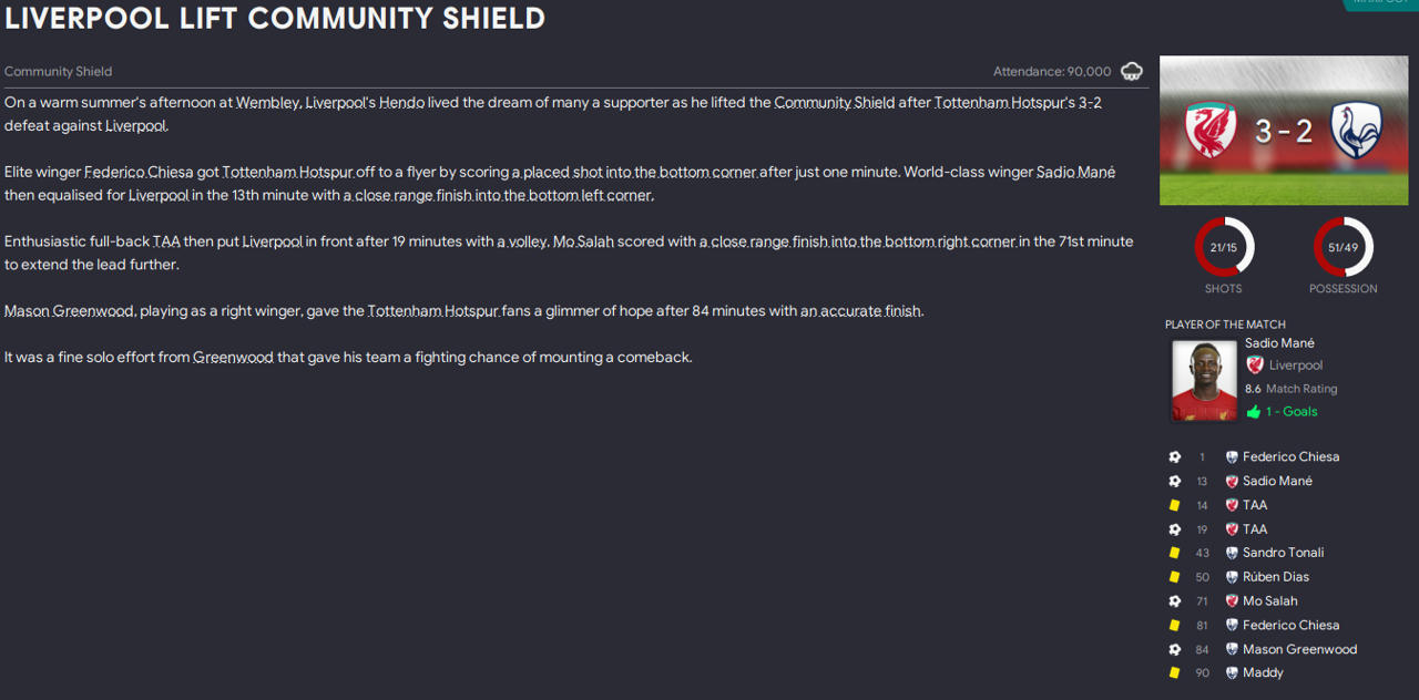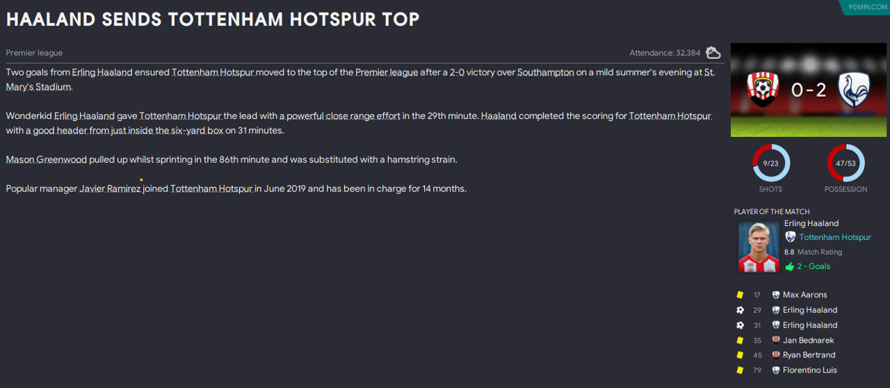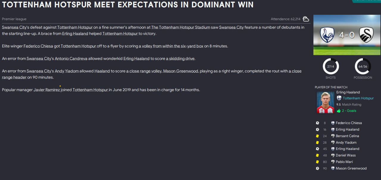 After a questionable 1st half, we made specific adjustments (moved Greenwod to AMR pulling Saka, using Henrichs as a LWB for Bard, and inserted Sigurosson late in the game for a Mo that had an average game). Literally the future played today against a strong team away from home, and the future certainly lived up to all their promise. Bournemouth were extremely lucky from a set piece SIX minutes of extra time (and the officials had given only 5), so to say they were fortunate is a MASSIVE understatement. I’m not mad or disappointment, I had some championship level talent out there and they played well. Hey Jude got himself in the scoresheet twice (of many to come I’m guessing) and Haaland got back to his scoring ways. I’m taking the positives and I destroyed the referees in the press conference of course.